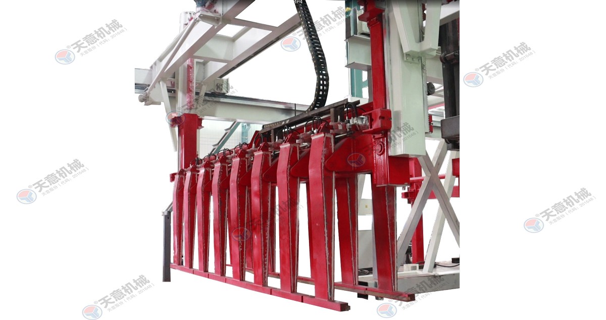 成品分垛吊機(jī):將蒸養(yǎng)車上的一模坯體吊運(yùn)至掰板輸送機(jī)上,然后將空側(cè)板吊運(yùn)至蒸養(yǎng)車上;切割工段空翻脫模機(jī)將??蚍D(zhuǎn)90°,放在切割小車支座上進(jìn)行脫模,脫模后的??蚺c清理后的側(cè)模板進(jìn)行合模,合膜后的空??虮坏?..